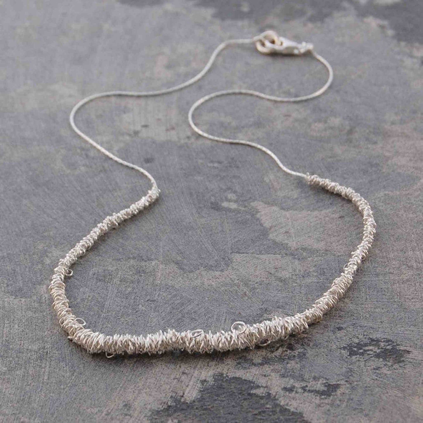 Multiple tiny silver wire ovals of different sizes are handcrafted to form this innovative and delicate Loops Silver Wire Necklace.