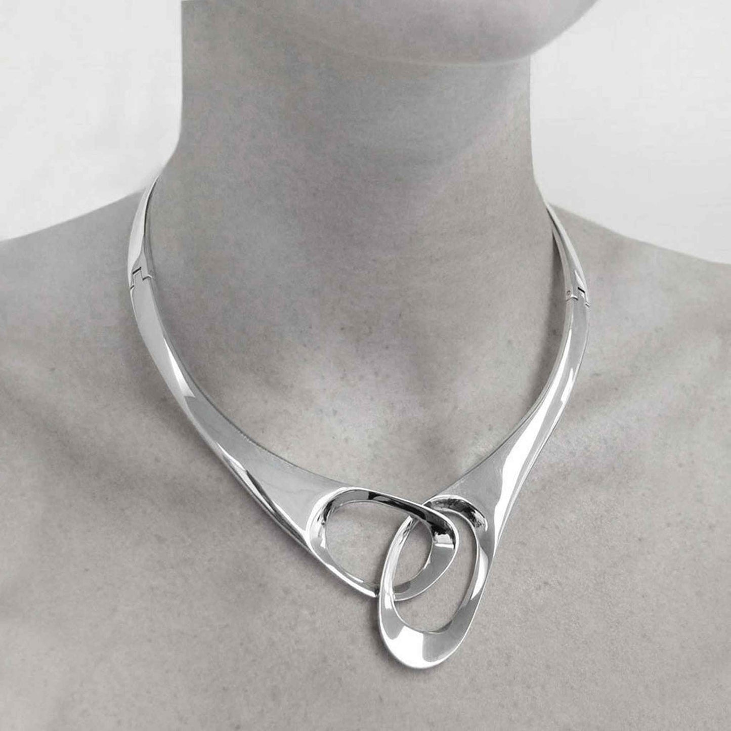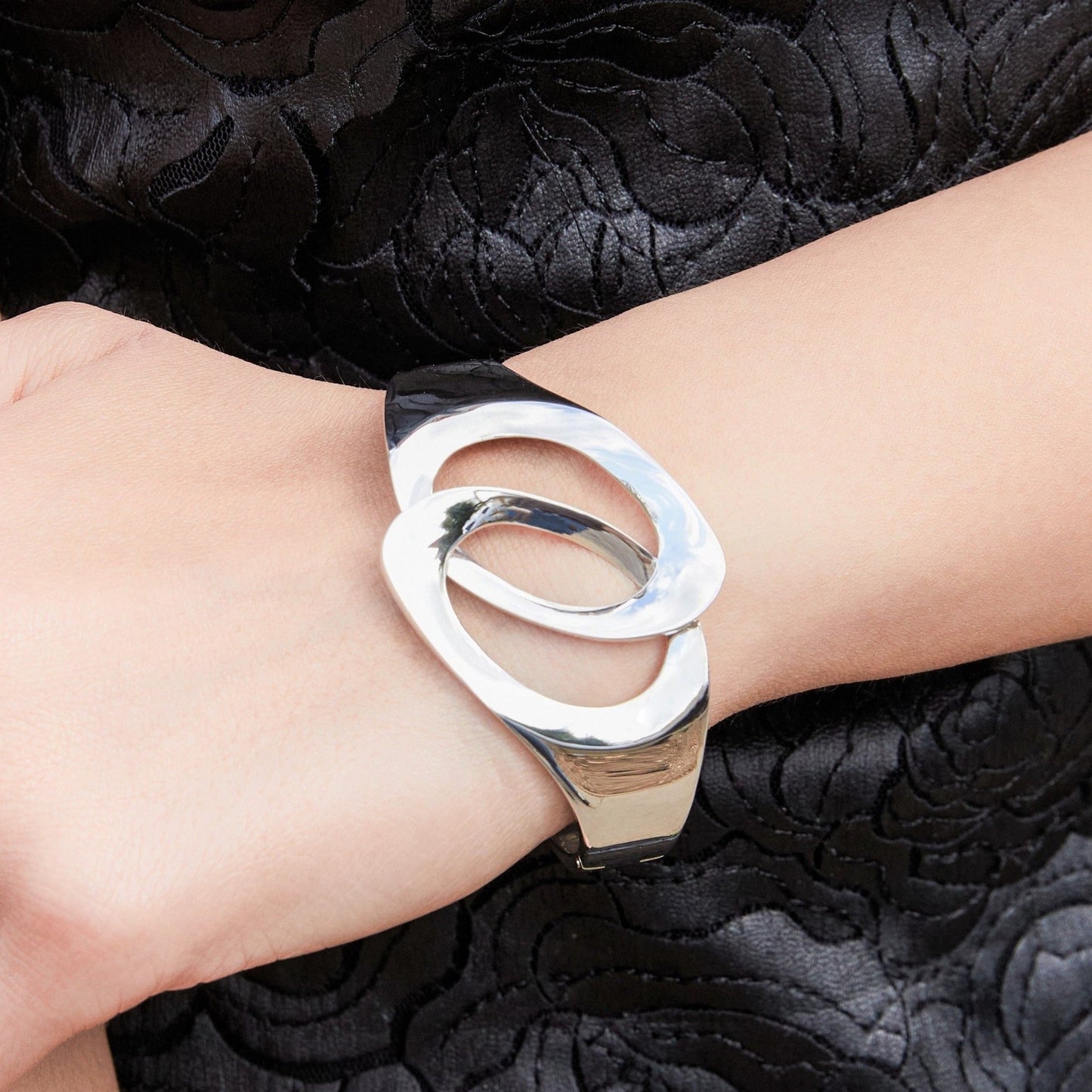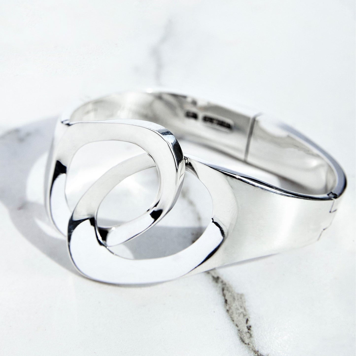 This heavy and contemporary Scissors Silver Hinged Bangle is made from solid sterling silver and, with its interlocking circles and discreet back hinge fastening is a true statement piece for any event.