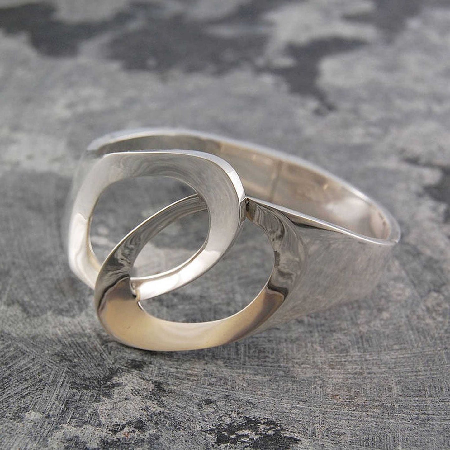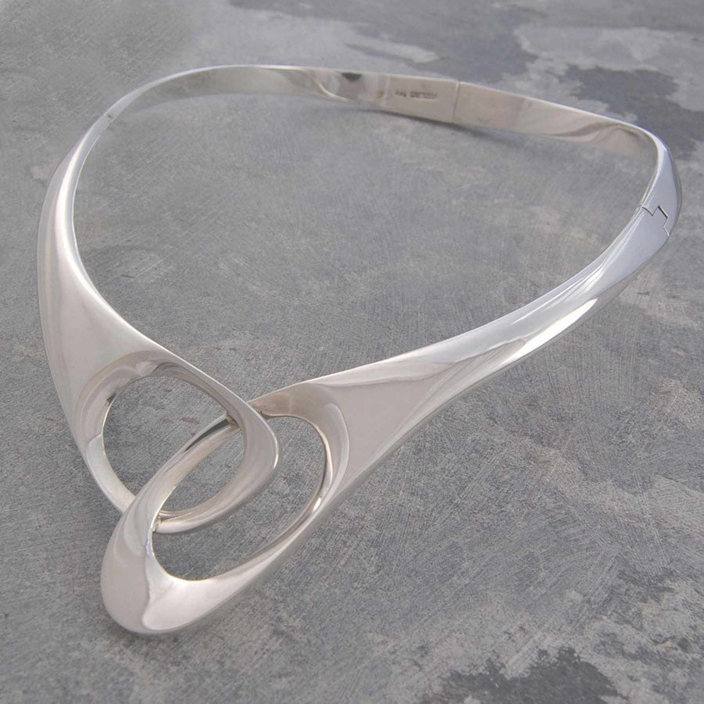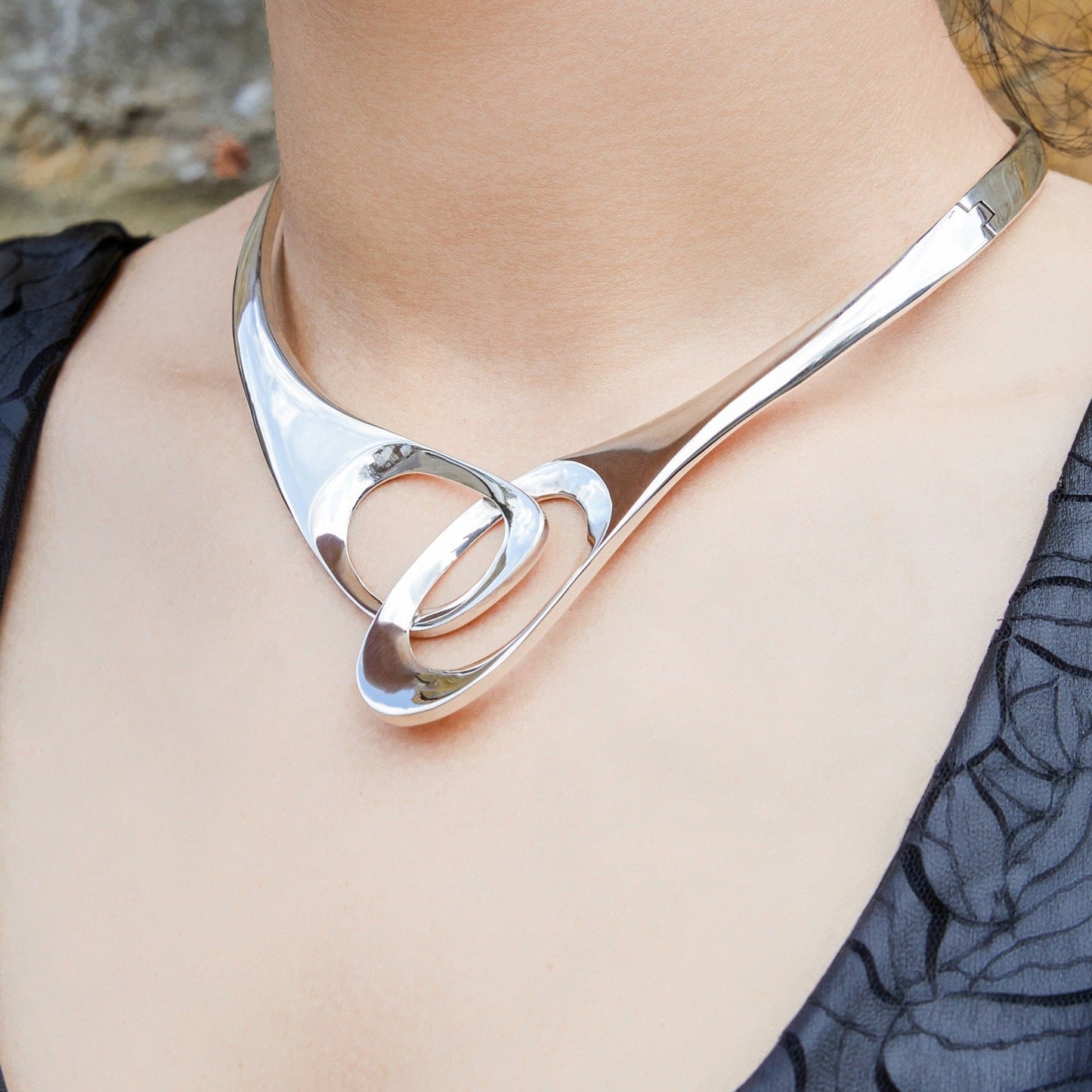 This heavy and contemporary Scissors Silver Hinged Bangle is made from solid sterling silver and, with its interlocking circles and discreet back hinge fastening is a true statement piece for any event.