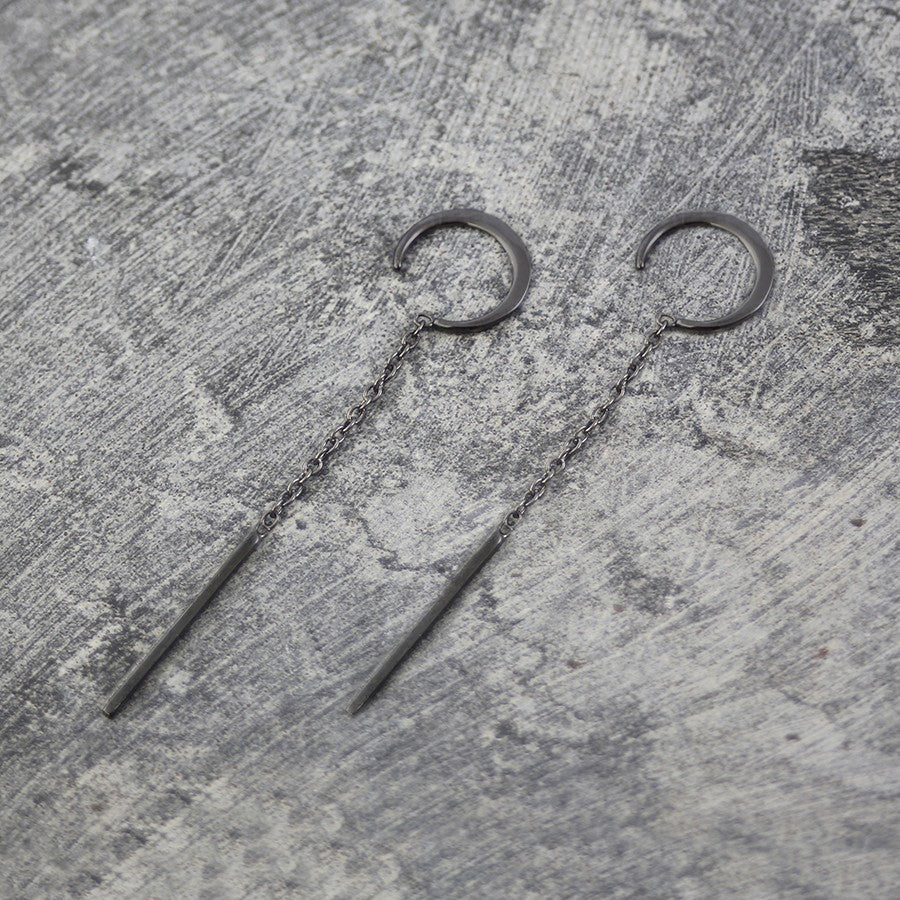 Eye-catching with a designer edge, these Oxidised Silver Black Hook Threader Earrings feature a polished bar and intricate chain suspended from a tusk-like hoop.