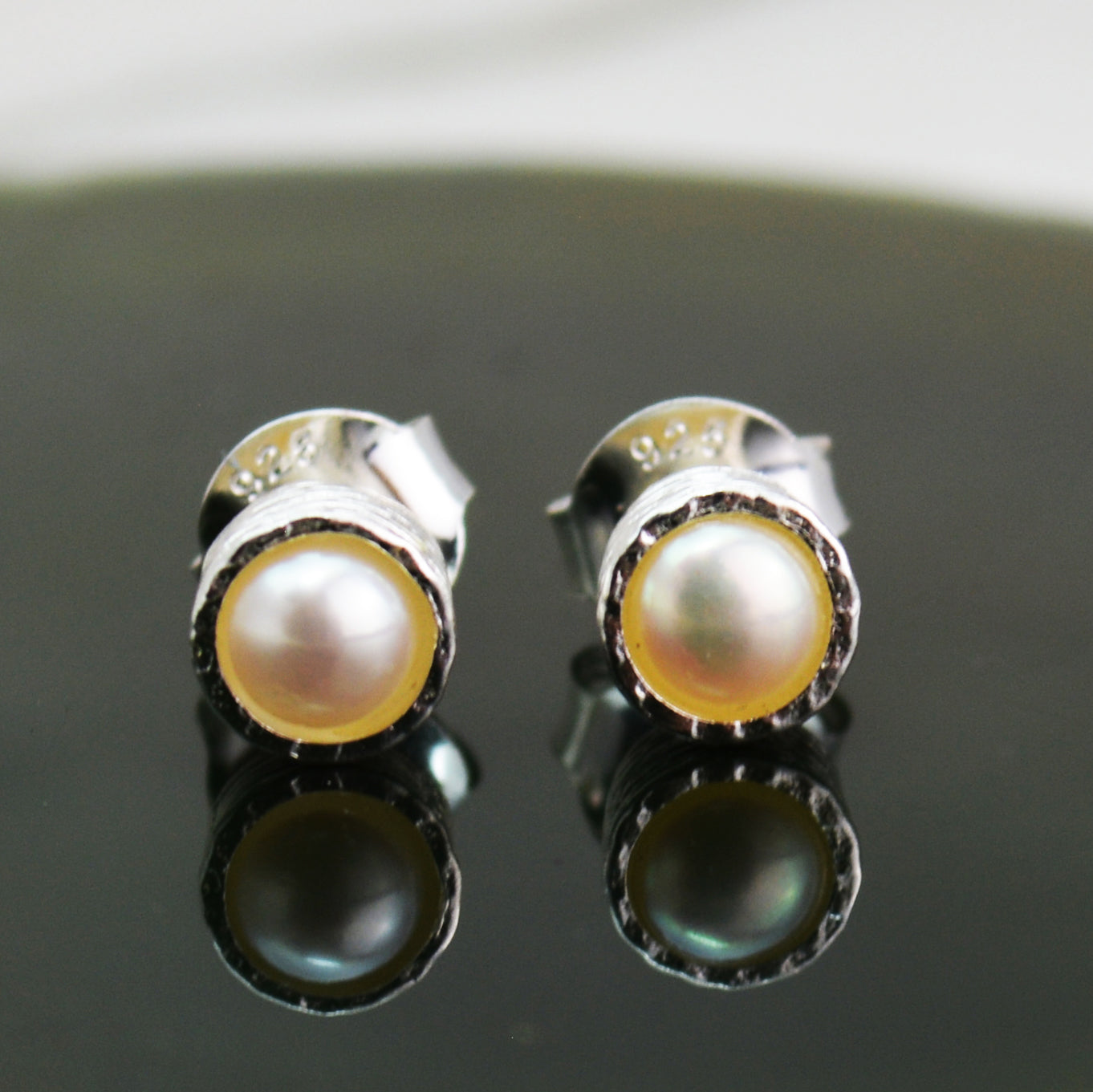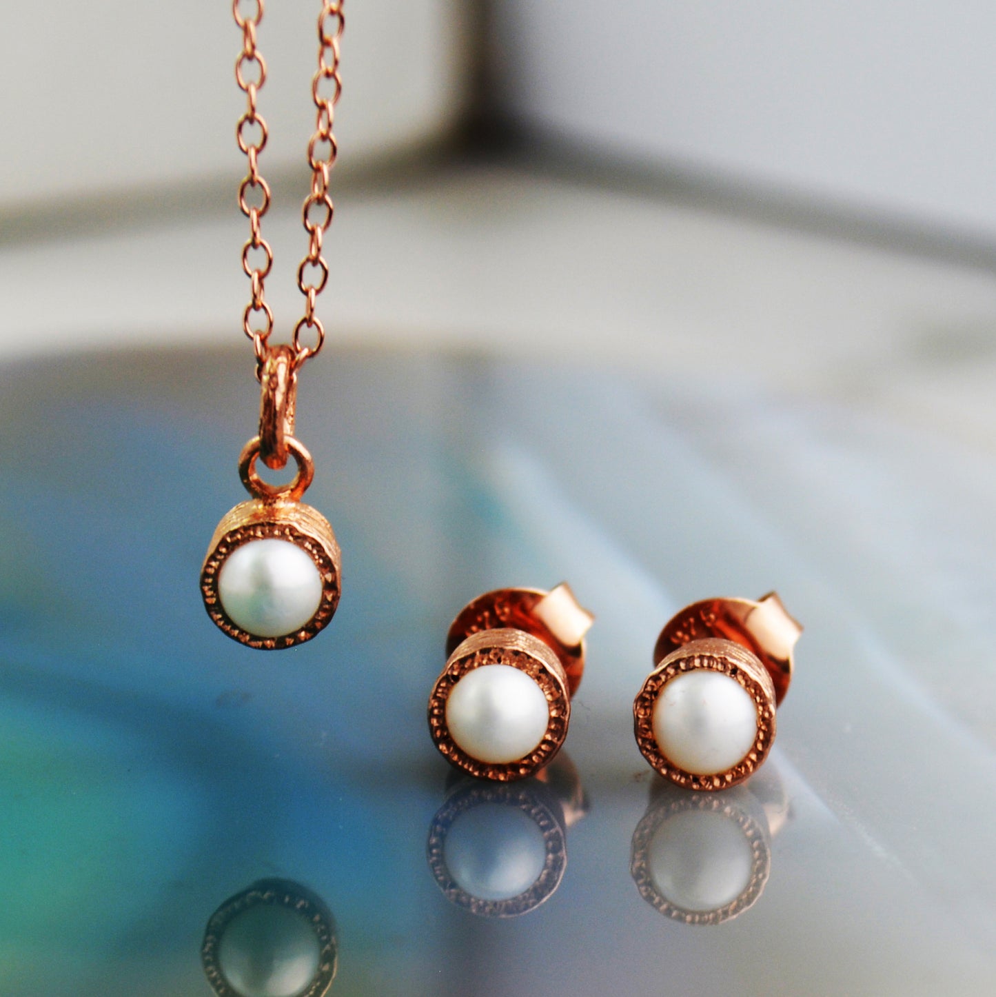 This simple Freshwater White Pearl June Birthstone Jewellery Set features matching stud earrings and pendant necklace with iridescent white pearls embedded in a textured Sterling Silver settings.