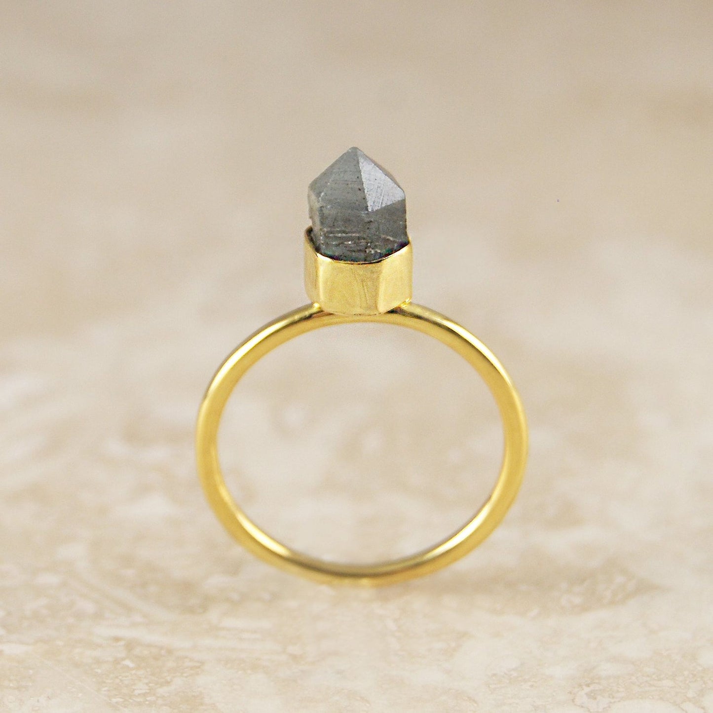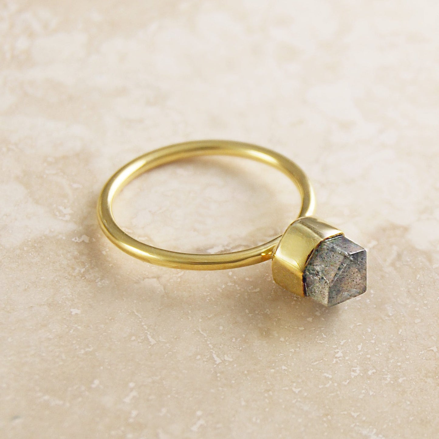 This gorgeous Labradorite Gemstone Ring features a cool semi-precious mesmerizing hexagonal labradorite gemstone. The striking faceted labradorite is beautifully set to catch the light from every angle, protruding elegantly from a polished vermeil band.