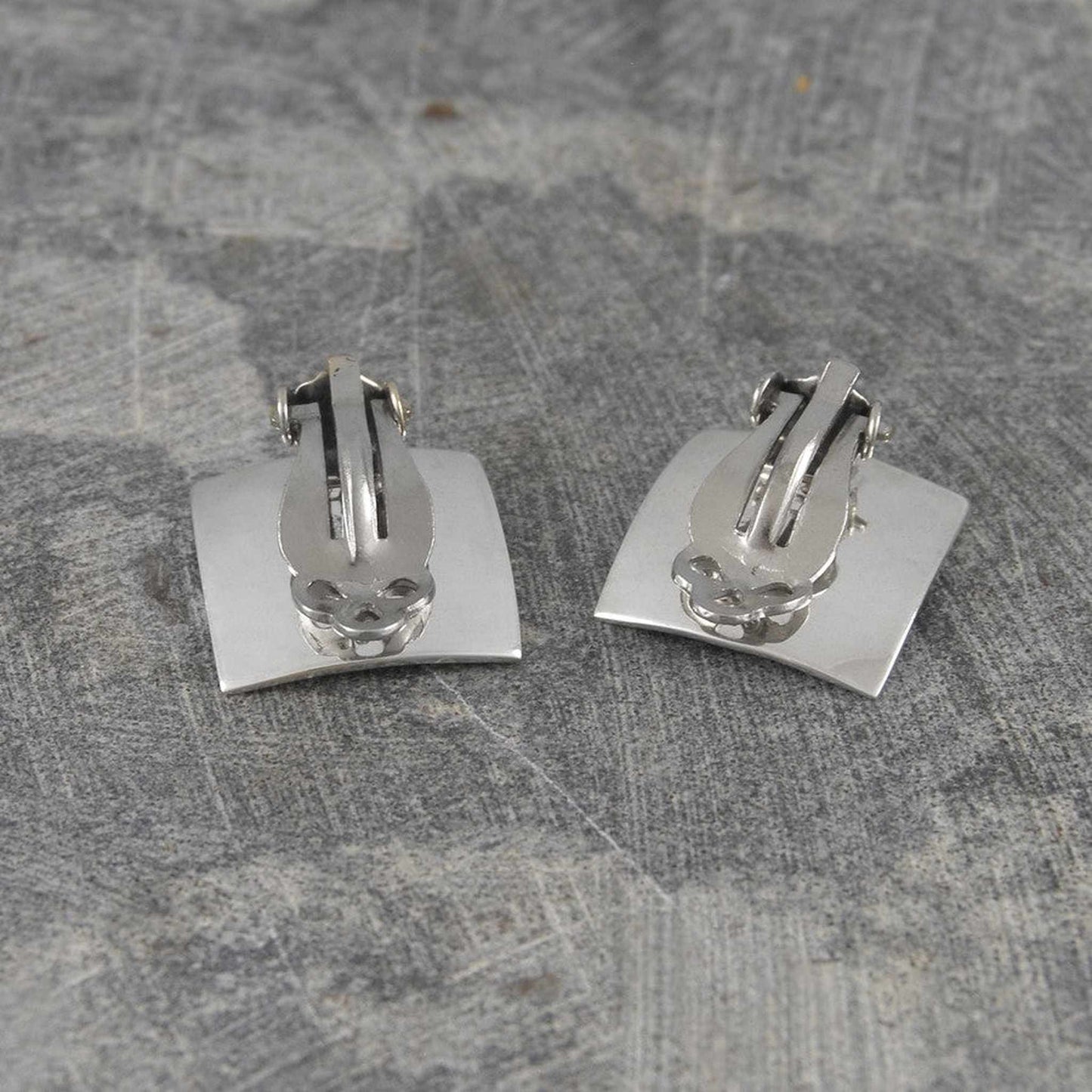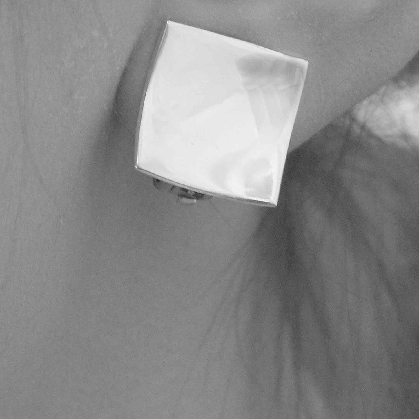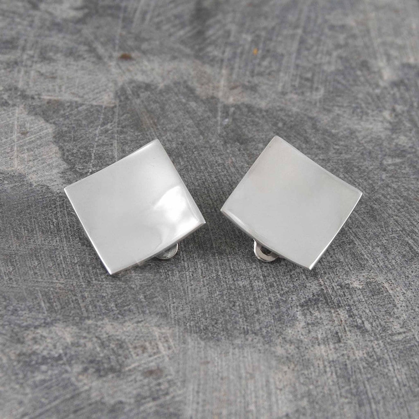 Classic, understated elegance defines these beautifully hand-crafted Concave Square Sterling Silver Clip On Earrings. Two shimmering and geometric discs of silver are highly polished giving a luxuriant, light reflecting effect, and attach to one's ear via wide clips which securely hold the earring in place.