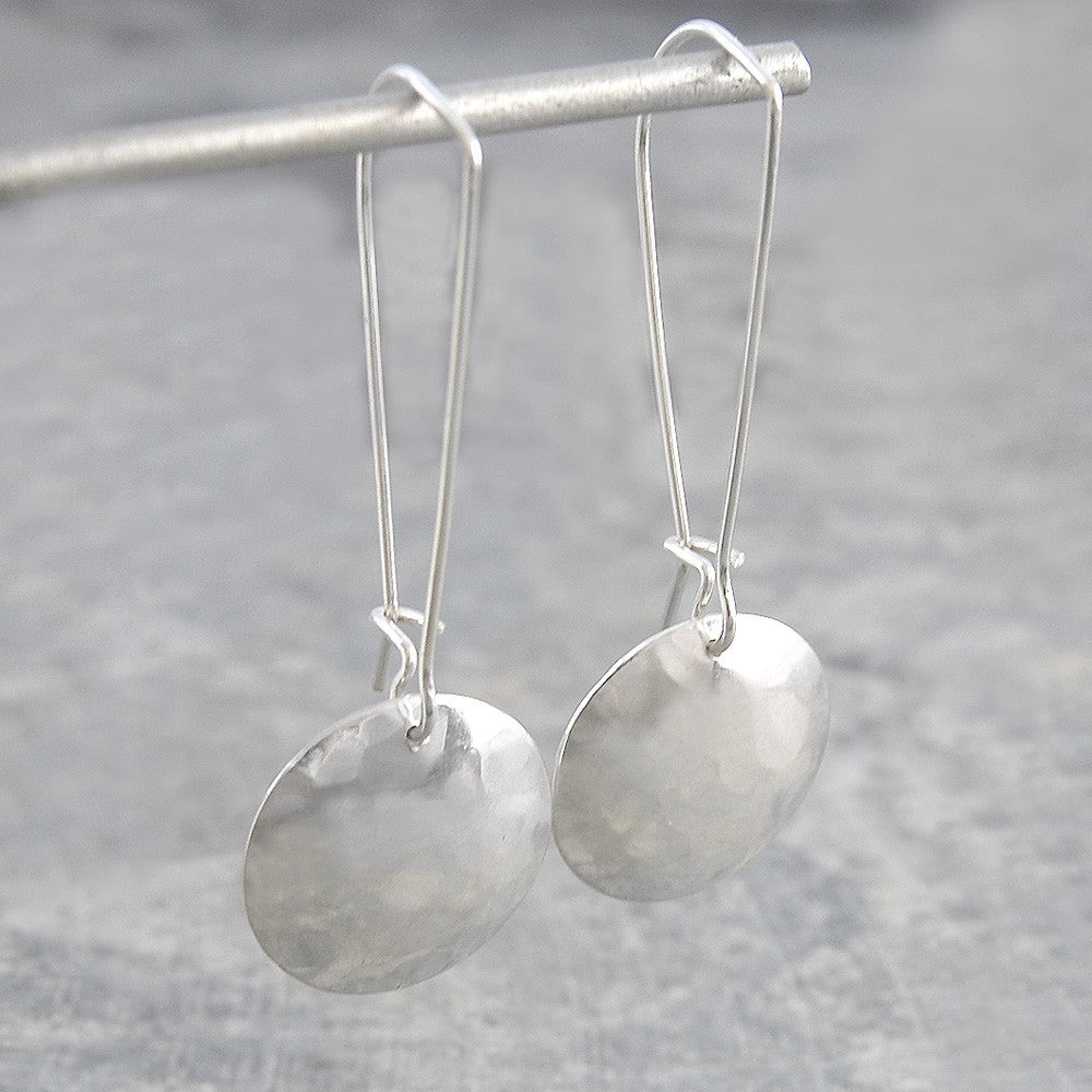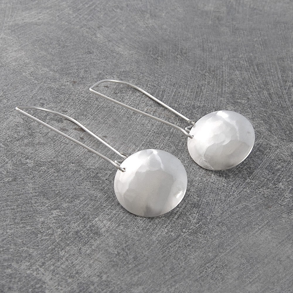 These modern, handmade Hammered Disc Silver Long Drop Earrings feature a gently hammered textured round disc swinging from a contemporary design earring hook. Serious silver dangle earrings!