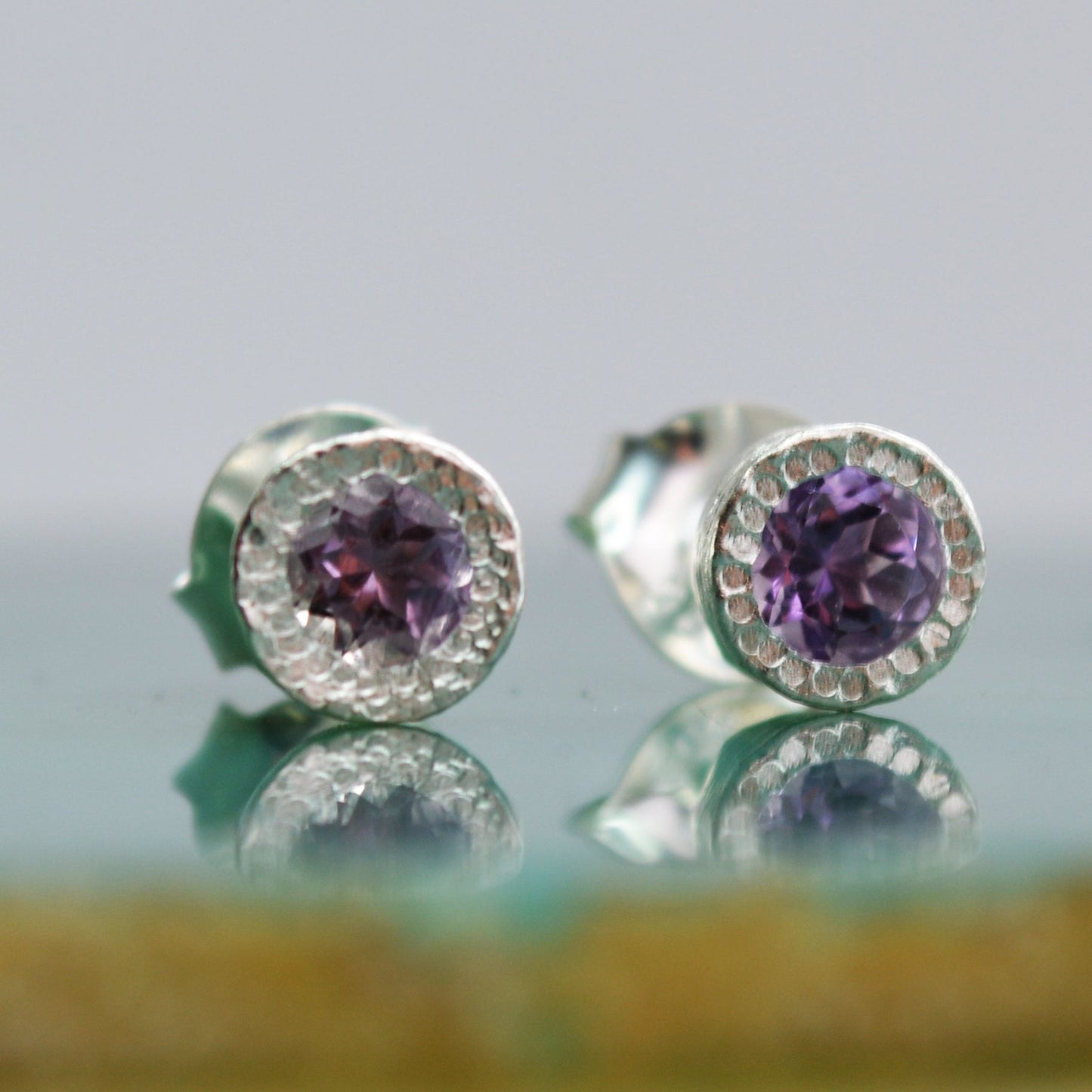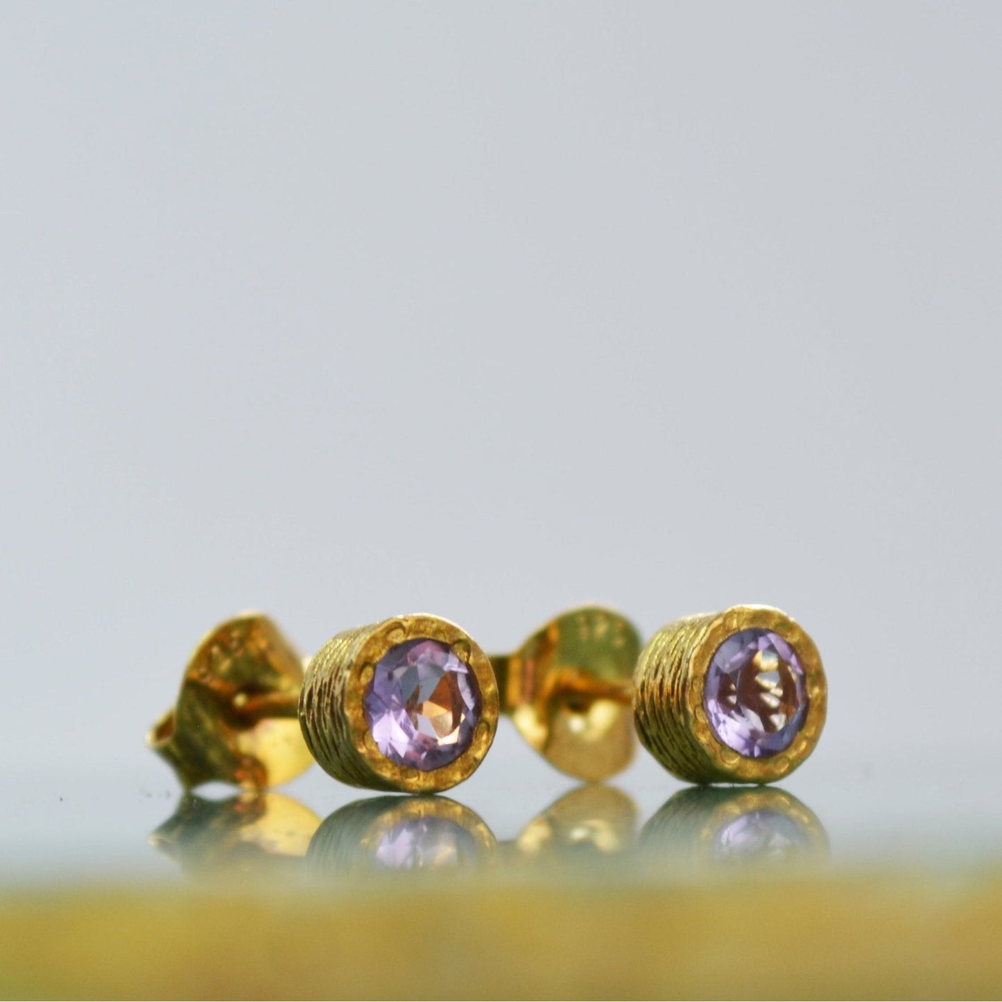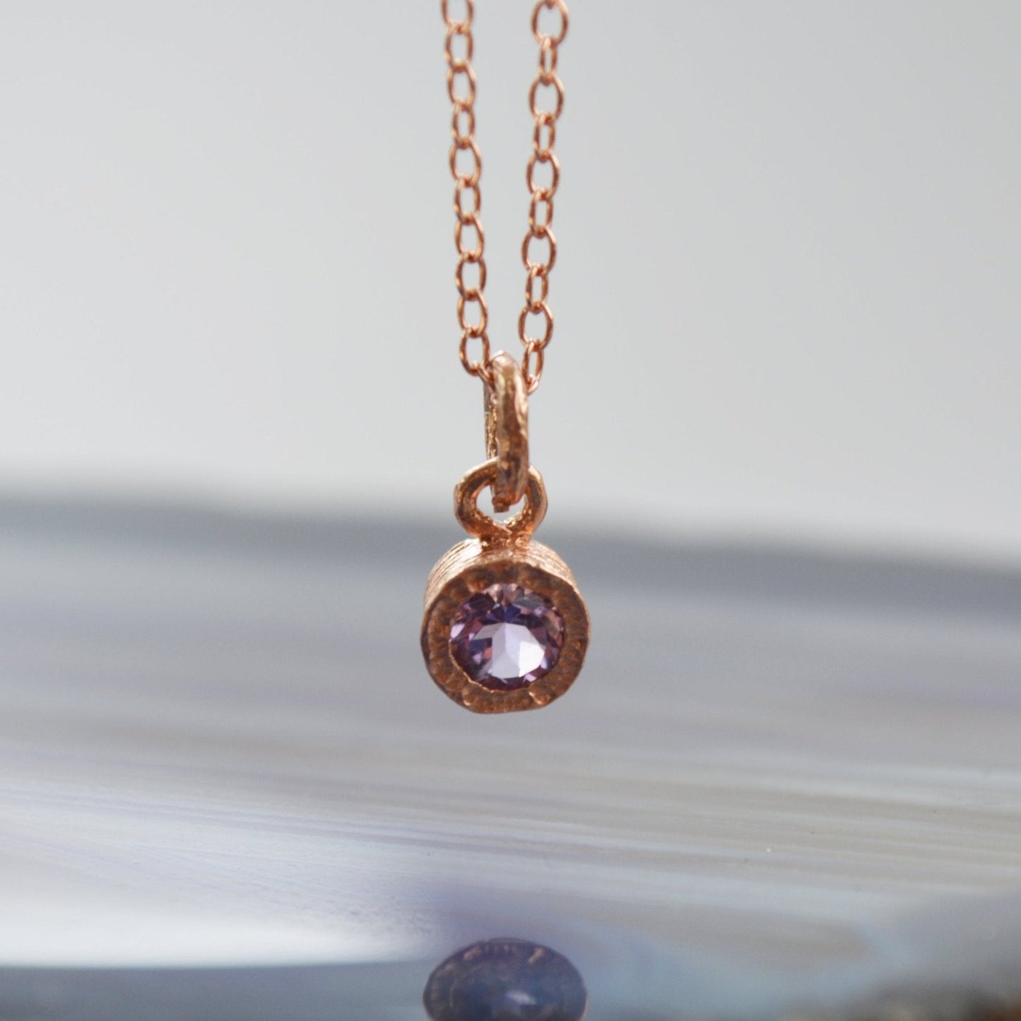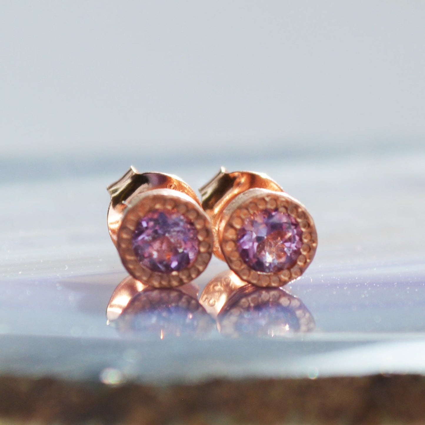 These Amethyst February Birthstone Jewellery Set features matching stud earrings and pendant necklace with faceted amethyst gemstones in a naturally textured rose gold plated Sterling Silver setting.
