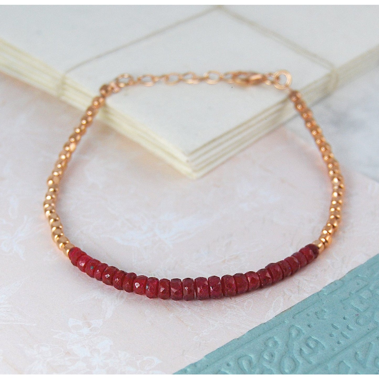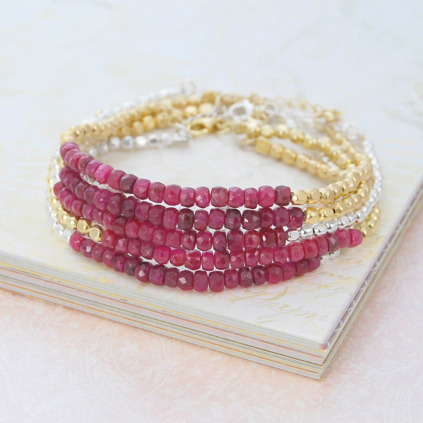 These Ruby July Birthstone Silver and Gold Friendship Bracelets feature hand faceted ruby beads, creating a high end free spirited look.