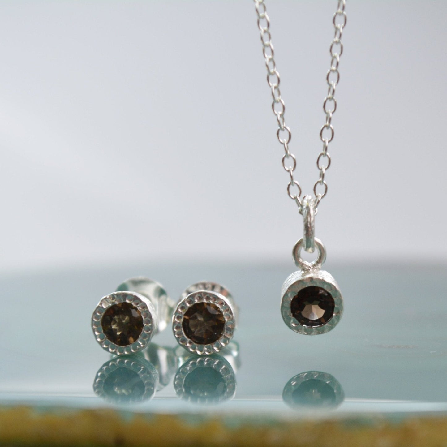 This Smoked Quartz Gold Jewellery Set features matching stud earrings and pendant necklace with faceted smoked quartz gemstones in naturally textured 18kt Gold plated Sterling Silver settings.