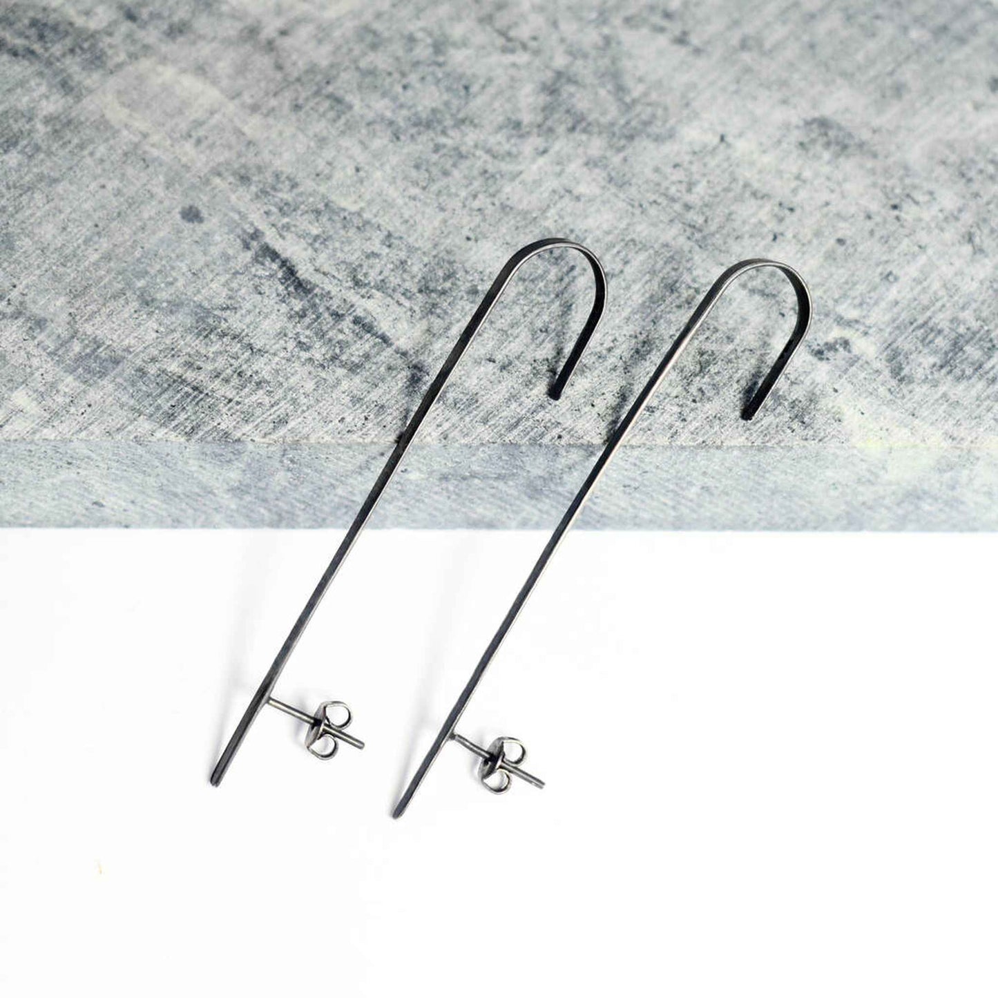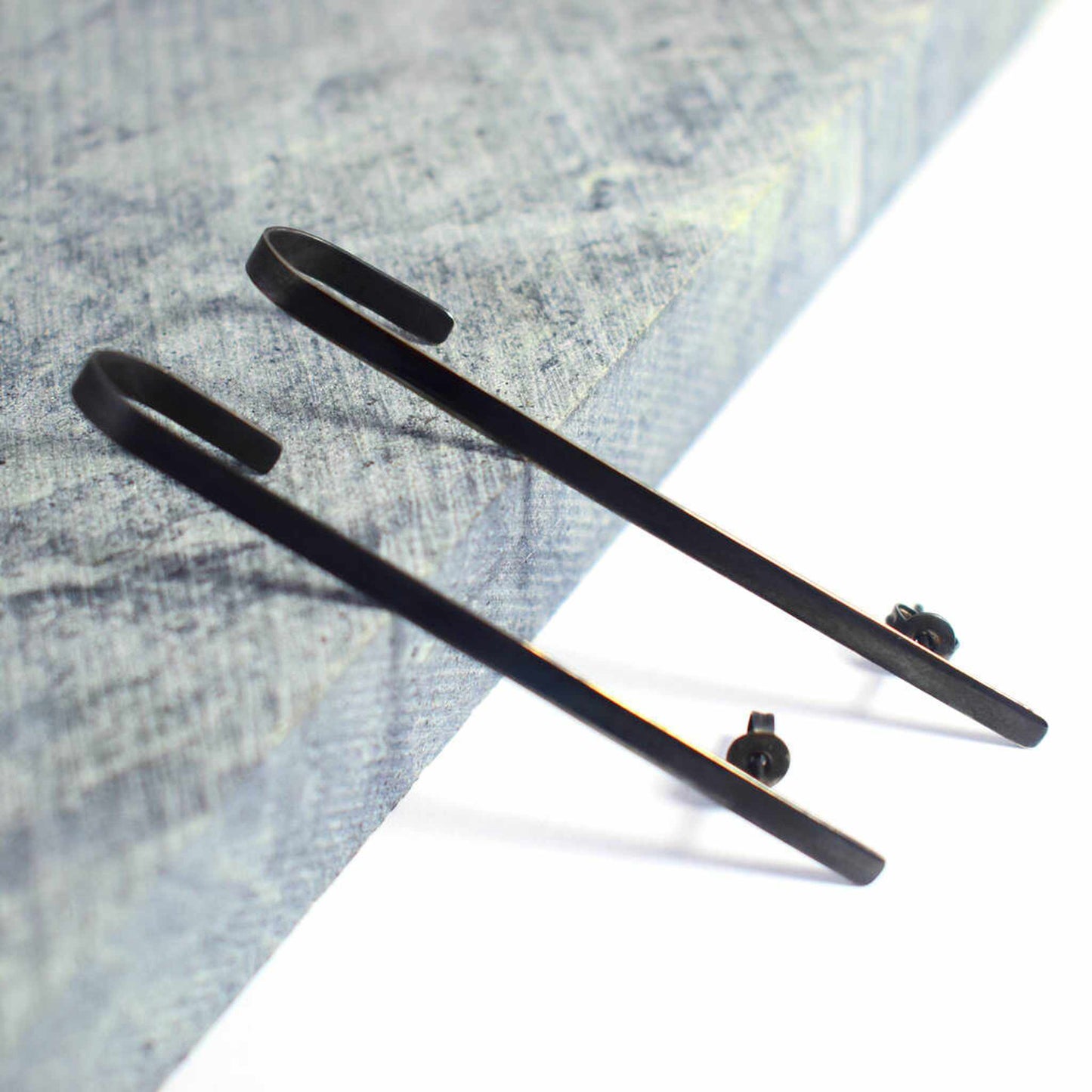 Bold, simple and effortlessly cool, this Black Oxidised Sterling Silver Bar Ear Cuff Earring is an ingenious blend of stud earring and ear cuff! The earring loops over the top of one's ear, and then a traditional post threads through your piercing atnd attached with a traditional butterfly.