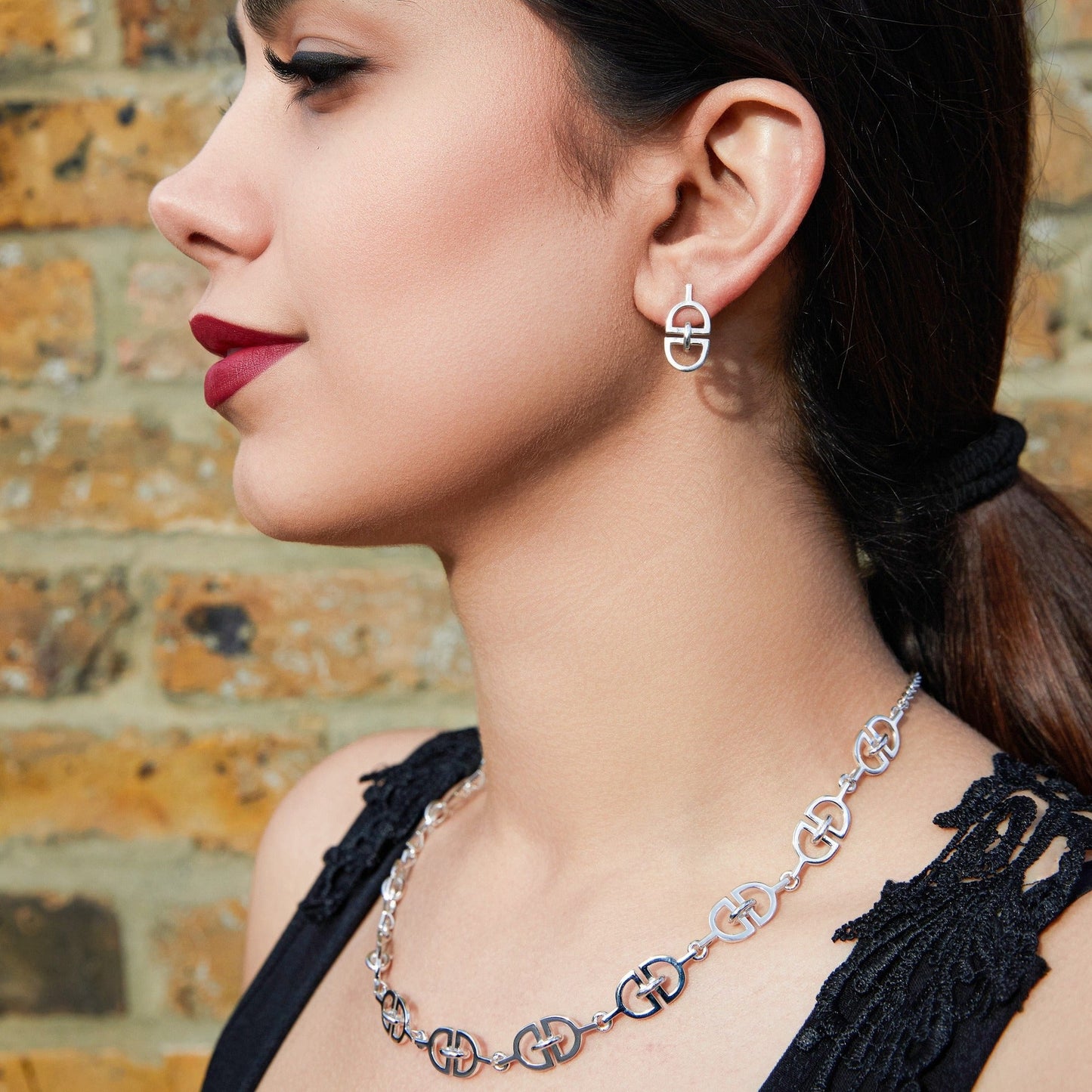 With its handmade bespoke links and functional t-bar fastening, this stunning sterling silver statement necklace is sophisticated, dramatic, and utterly timeless.