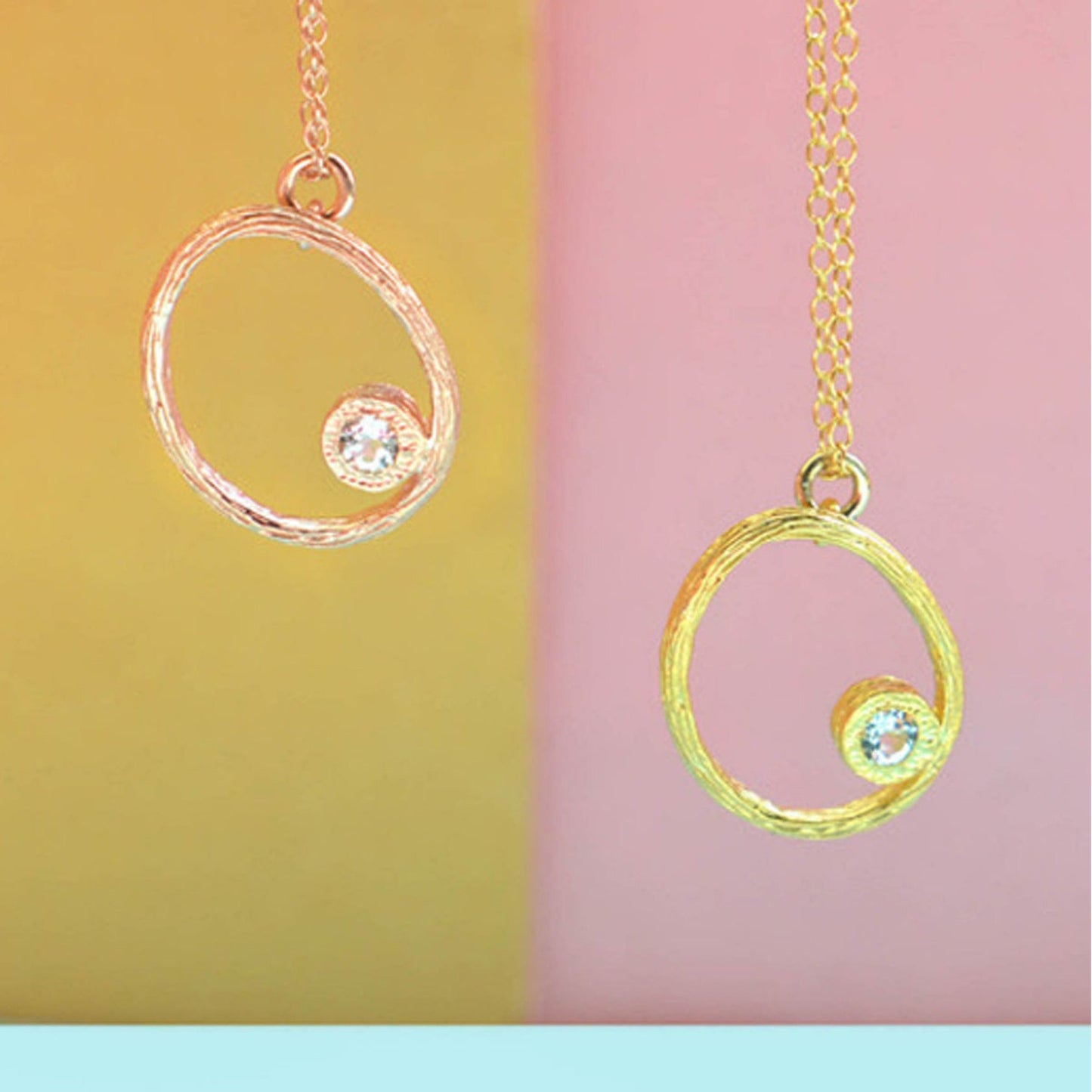 This dainty White Topaz Gold November Birthstone Oval Pendant features a White Topaz semi precious stone in a naturally textured Gold plated Sterling Silver setting set within a textured silver oval, representing a mother and child relationship.