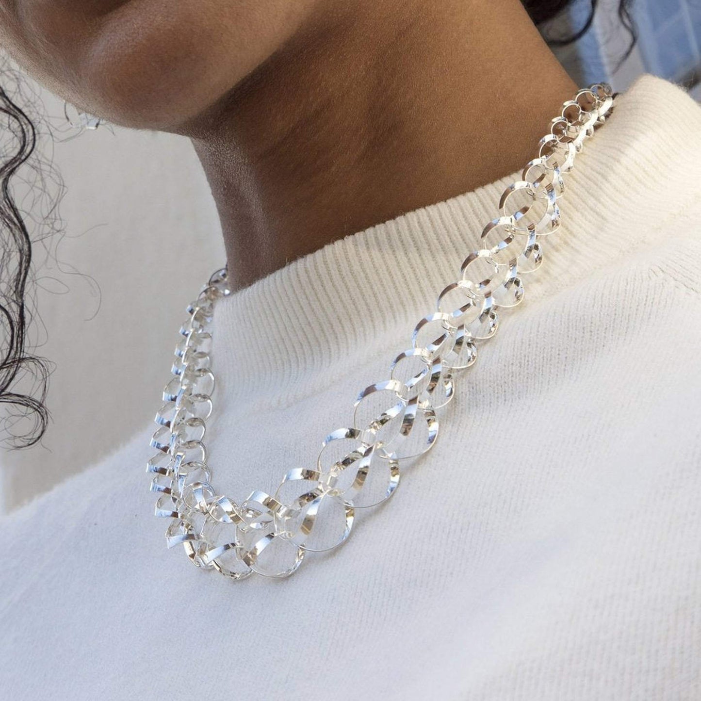 Intricate, architectural and utterly unique, this Sterling Silver Fluid Statement Bracelet features graduated interlocking rings which are shaped by hand to create this beautifully fluid piece.