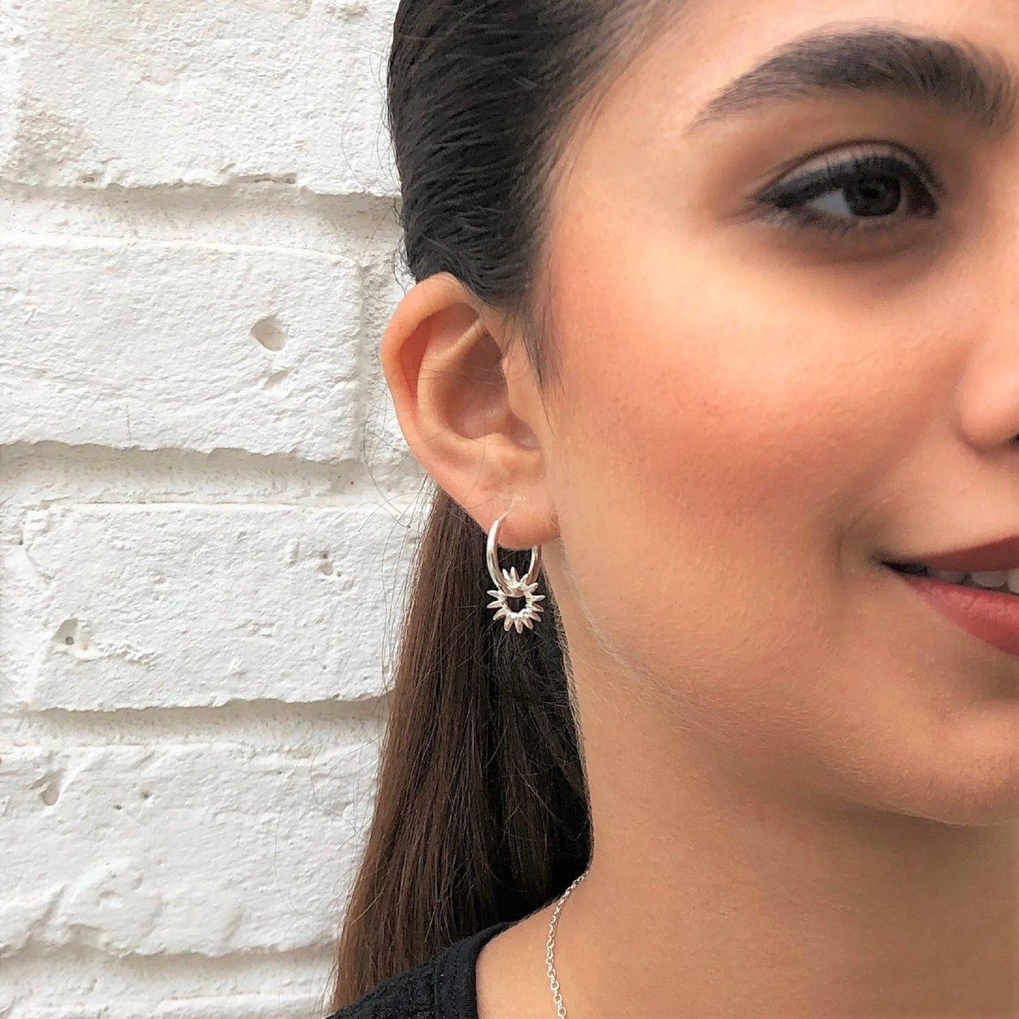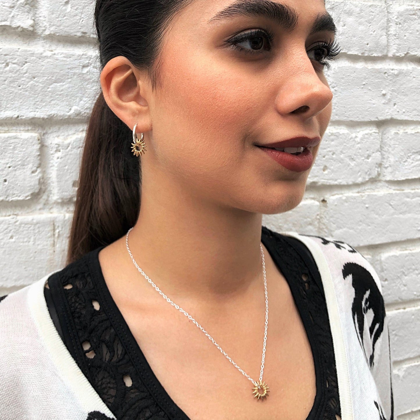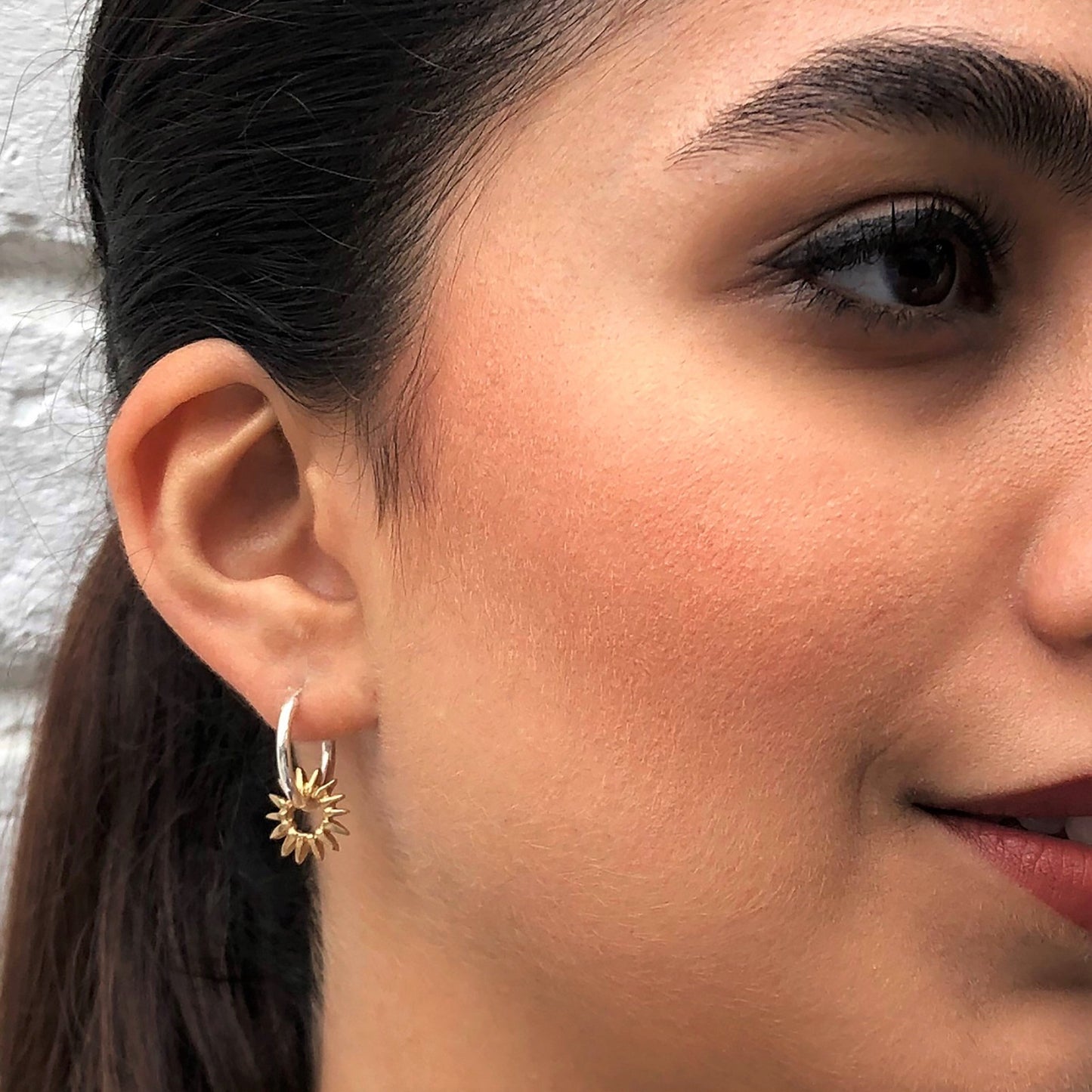 Intricately hand crafted these Sunray Small Gold Huggie Hoop Earrings feature an impressionistic gold plated sun motif suspended from dainty sterling silver sleeper hoops. Guaranteed to bring brightness and light into your life!