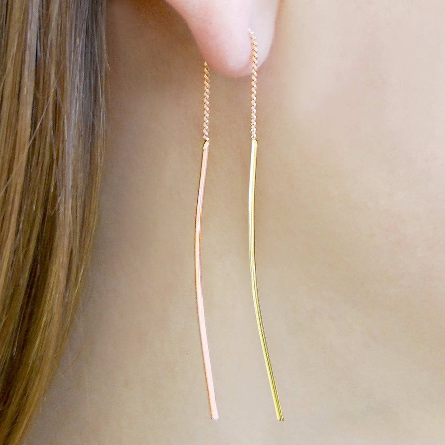 Sleek and stylish, these delicate threader Silver and Gold Drop Earrings have two polished sterling silver curved bars - one carefully gold plated - suspended from a delicate chain.