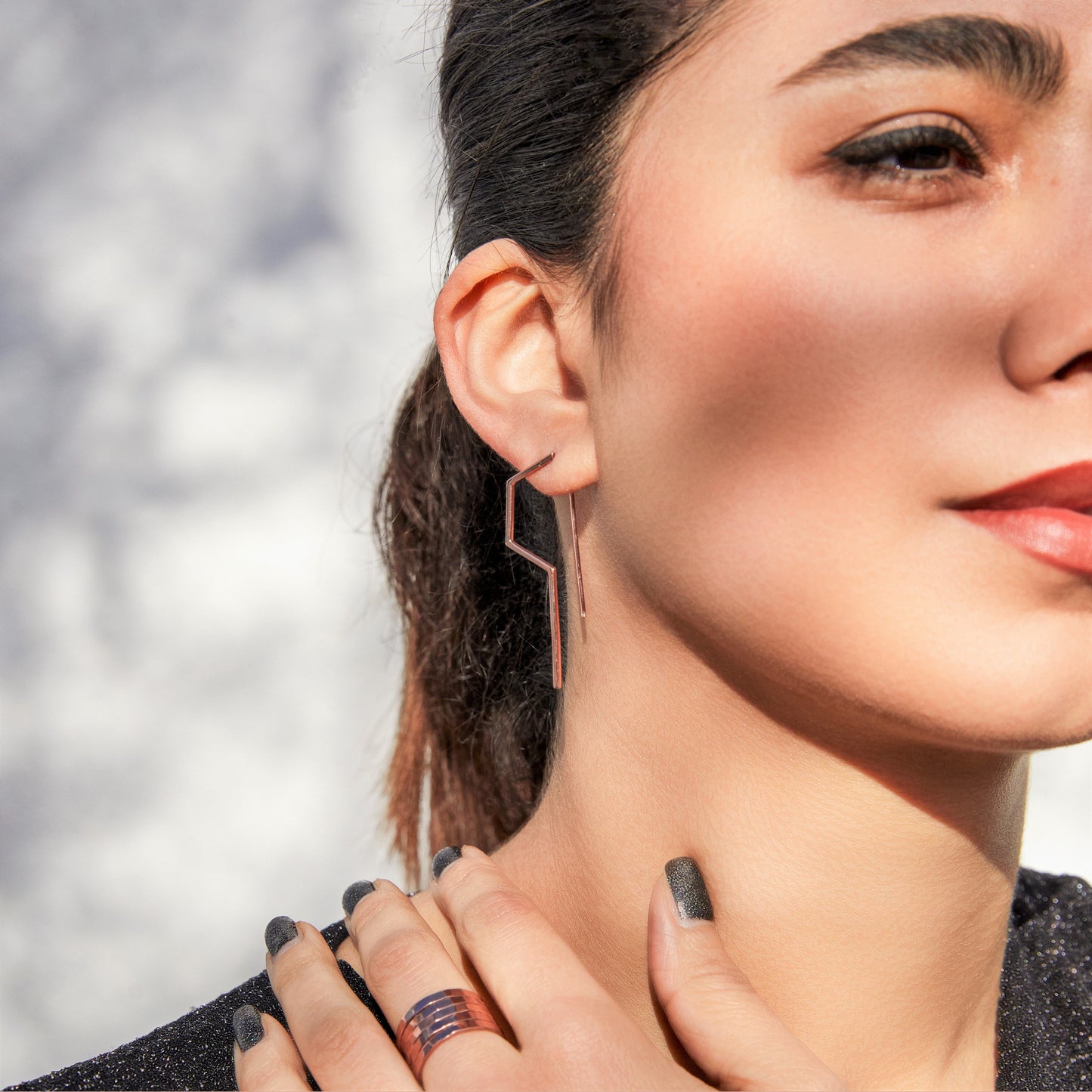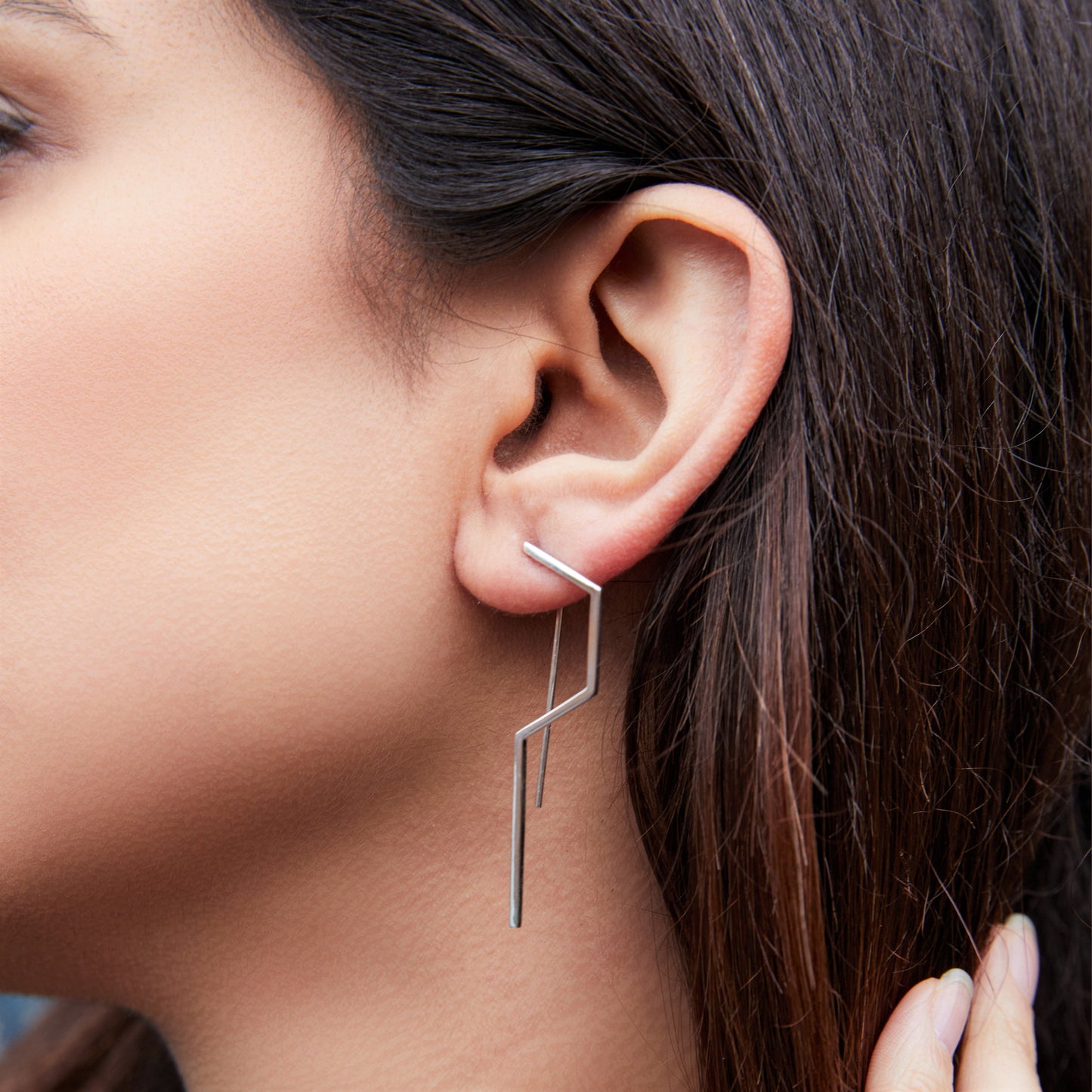 Beautifully handmade minimalist modern drop earrings, forged from Sterling Silver and with a distinctive geometric shape, the perfect earring for lovers of the unconventional.