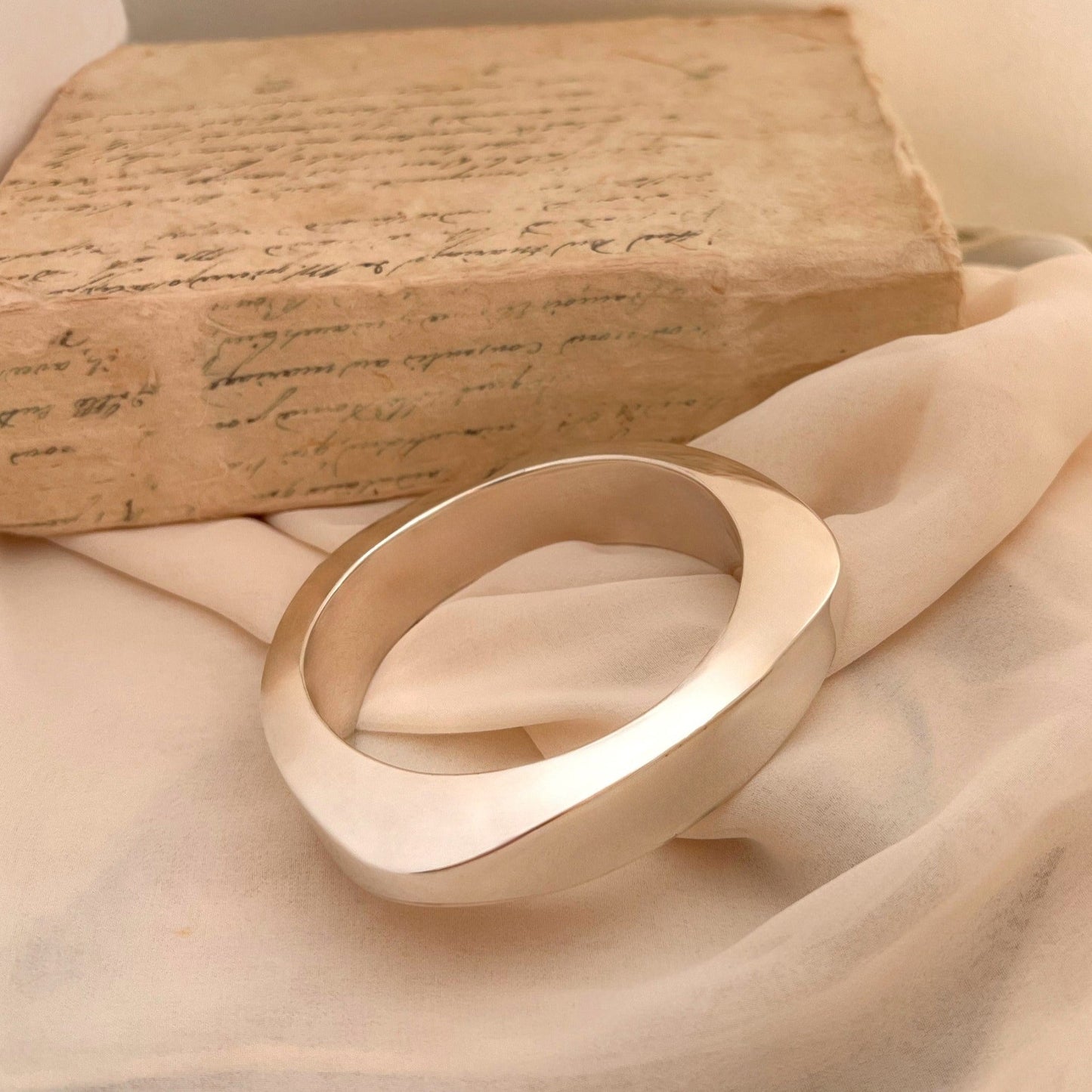 A technique layering pure silver onto a mould to create lightweight yet durable, sculptural bangles. These styles are not suitable for engraving.
