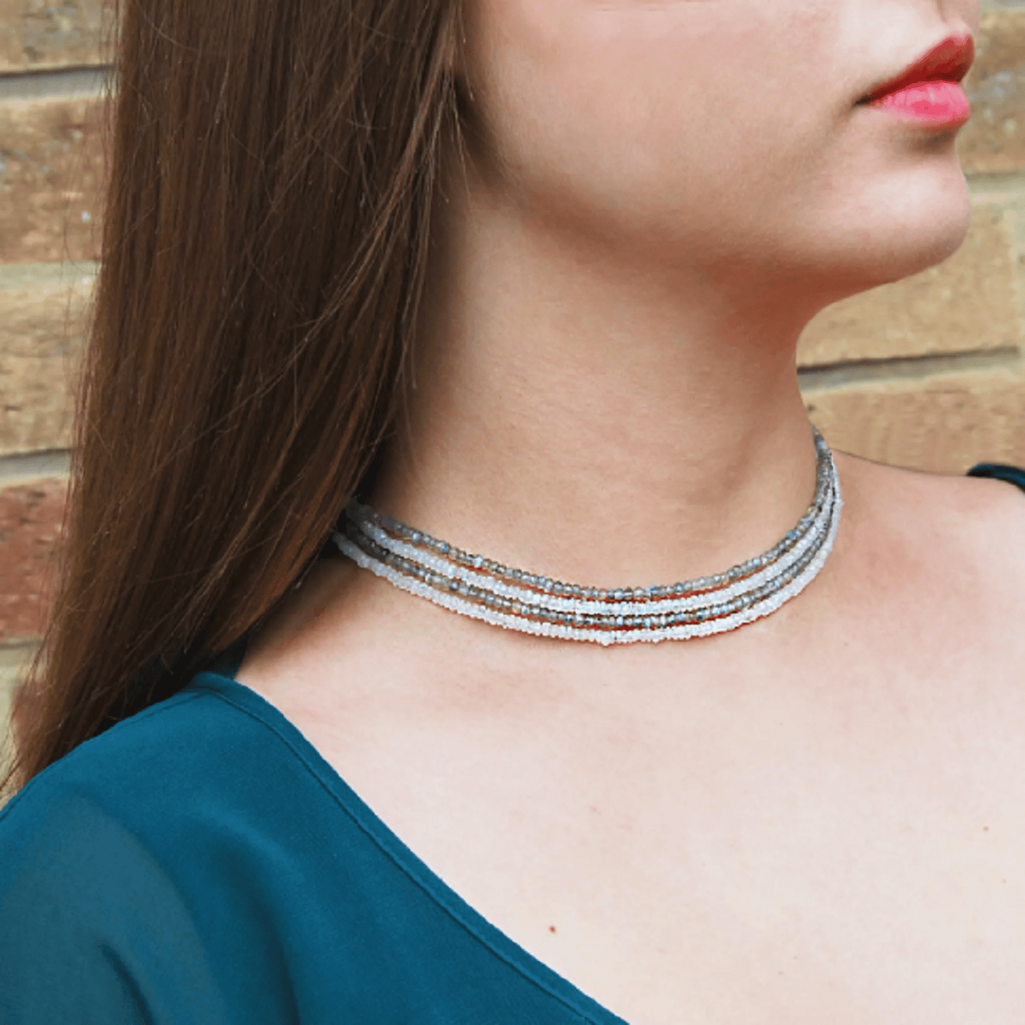 This elegant necklace features a cluster of faceted Labradorite and Moonstone Gemstone nuggets creating a beautiful colour toned gemstone necklace.
