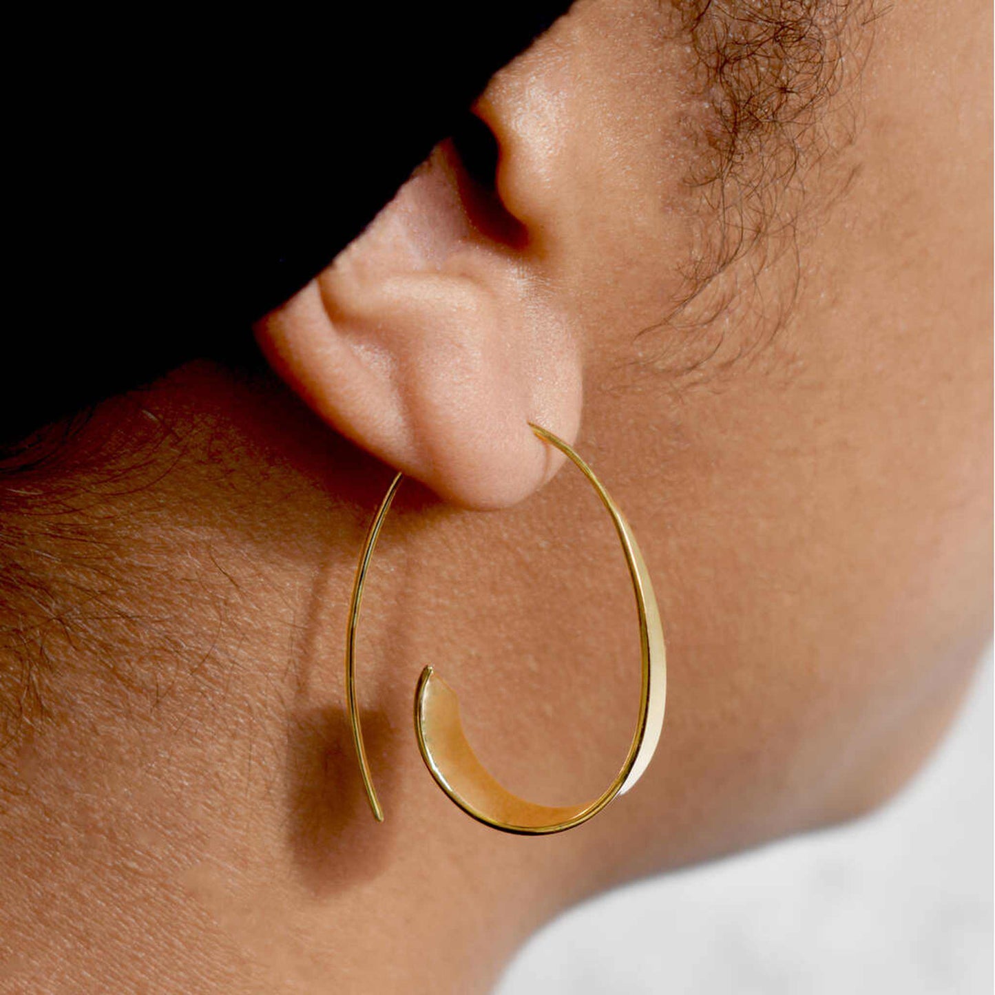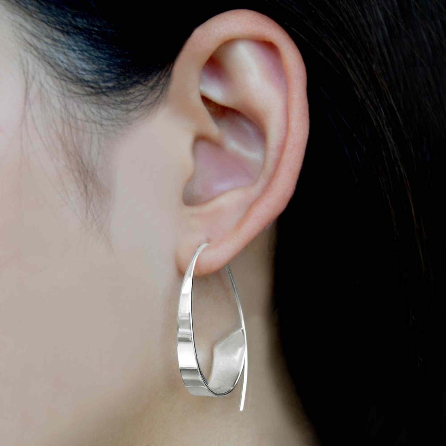Curled Ribbon Rose Gold Hoop Earrings that work with everything, these sterling silver 18k rose gold-plated drop earrings feature a curved tapered ribbon of silver.