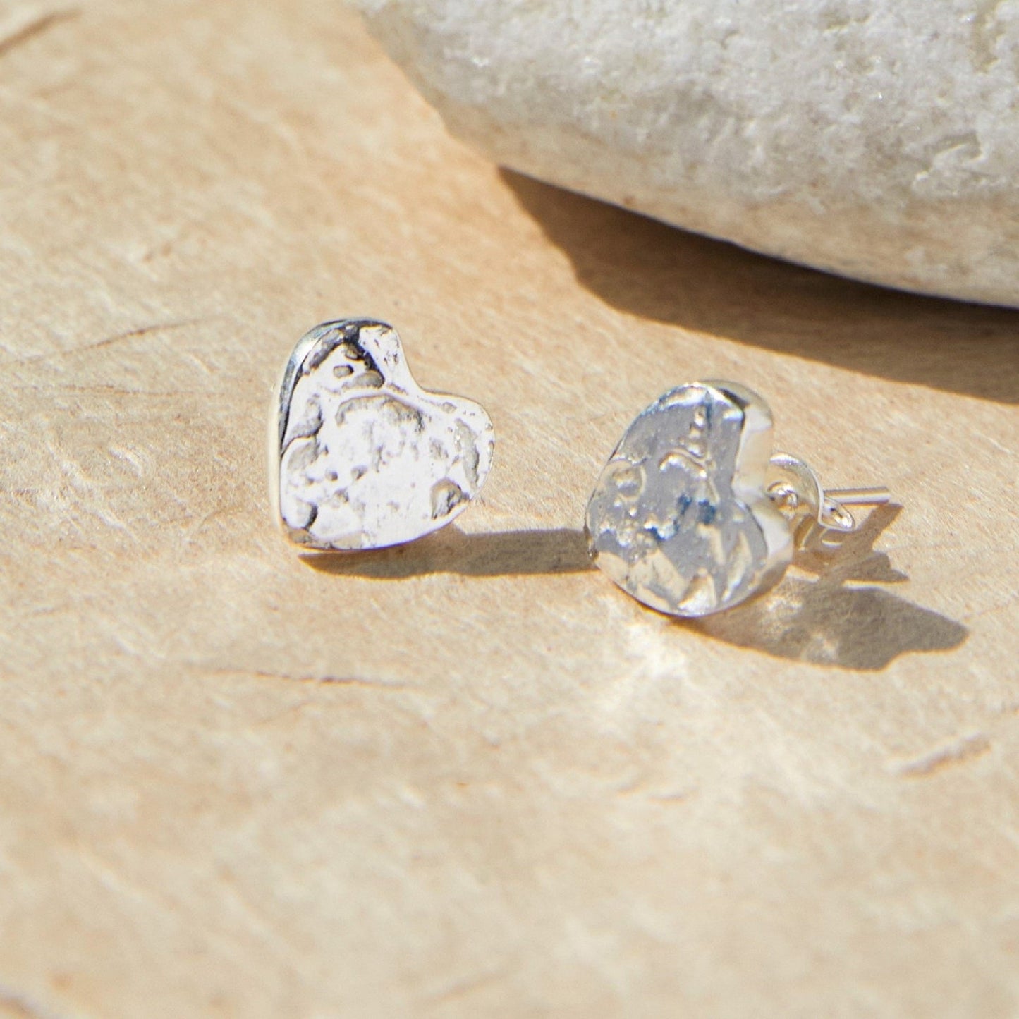 An incredibly simple, yet beautiful pair of solid silver stud earrings composed of a pair of dainty organically textured hearts. These Organic Heart Silver Stud Earrings can be worn anytime and on any occasion.