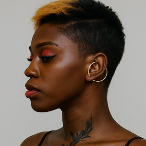 These minimalist Gold Hoop Ear Cuff earrings are a modern on-trend innovative design ingeniously blending earring and ear cuff to give you a geometric designer look without the pain of multiple piercings!