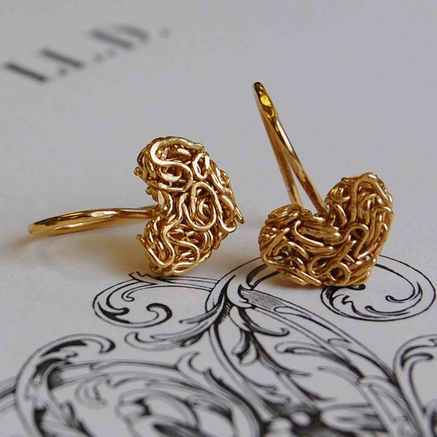 Our master silver smith Antonio expertly and delicately sculpts sterling silver wire to create these Mesh Heart Gold Stud Earrings. Once the wire is tooled to requirement it is compressed into a silver heart motif and attached to a gold plated silver hook.